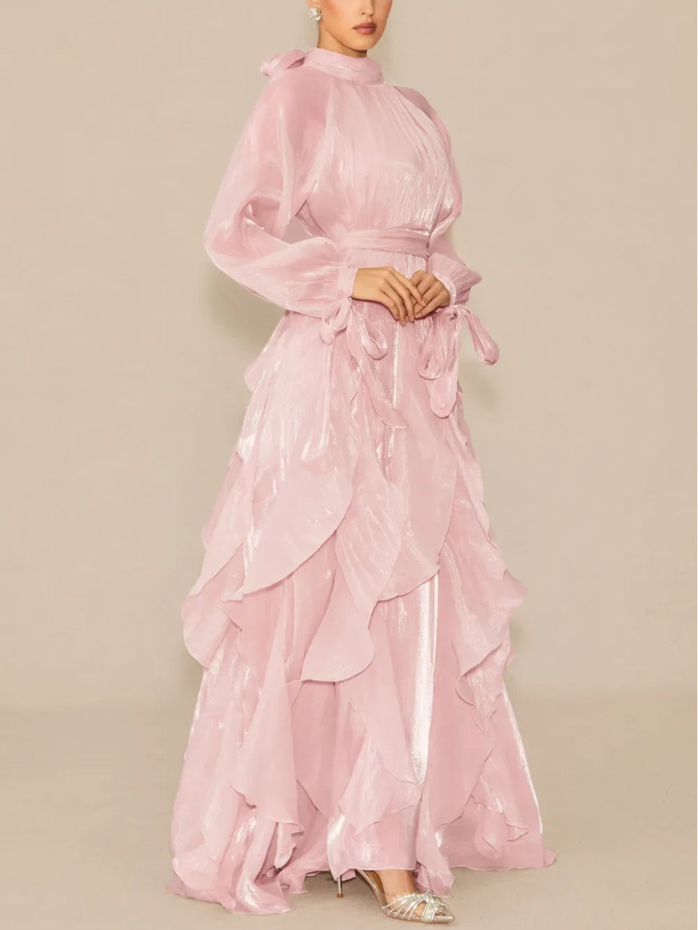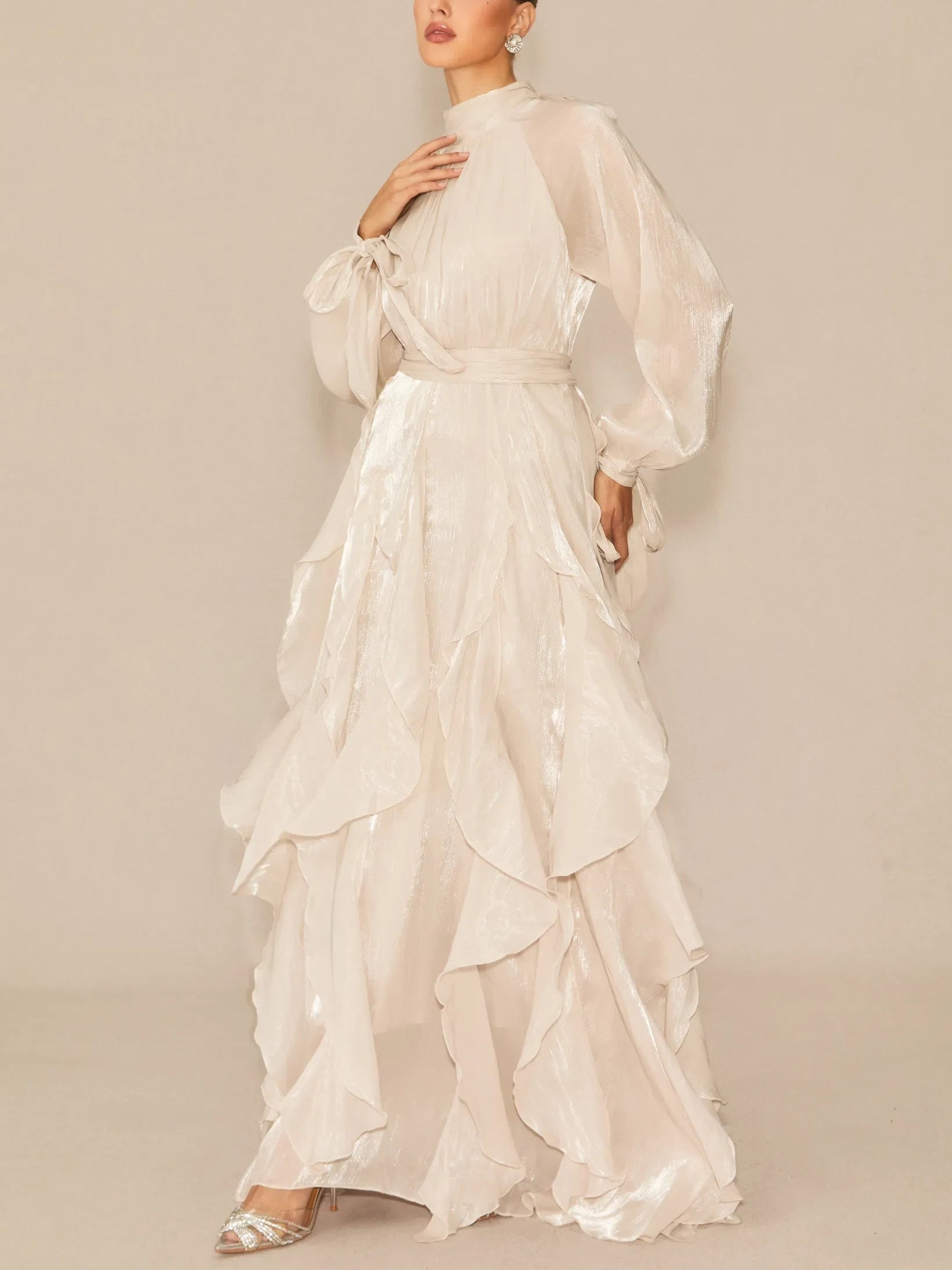 Romantic and elegant, this maxi dress features puff balloon sleeves, a gathered bodice, high neck with bow detail, and self-tie cuffs. The ruffle-trimmed skirt and tied waist create a flattering silhouette, perfect for weddings, parties, and formal events.