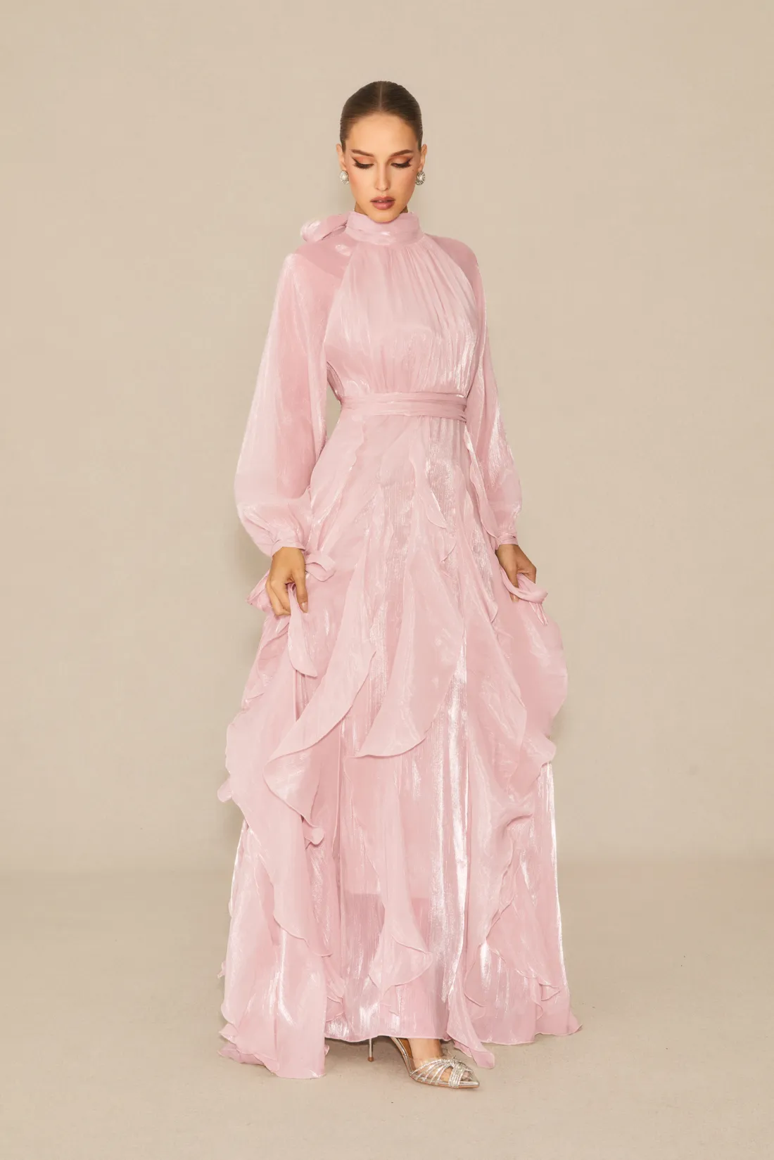 - Ruffle Trim & Maxi Length – Elegant movement and feminine charm