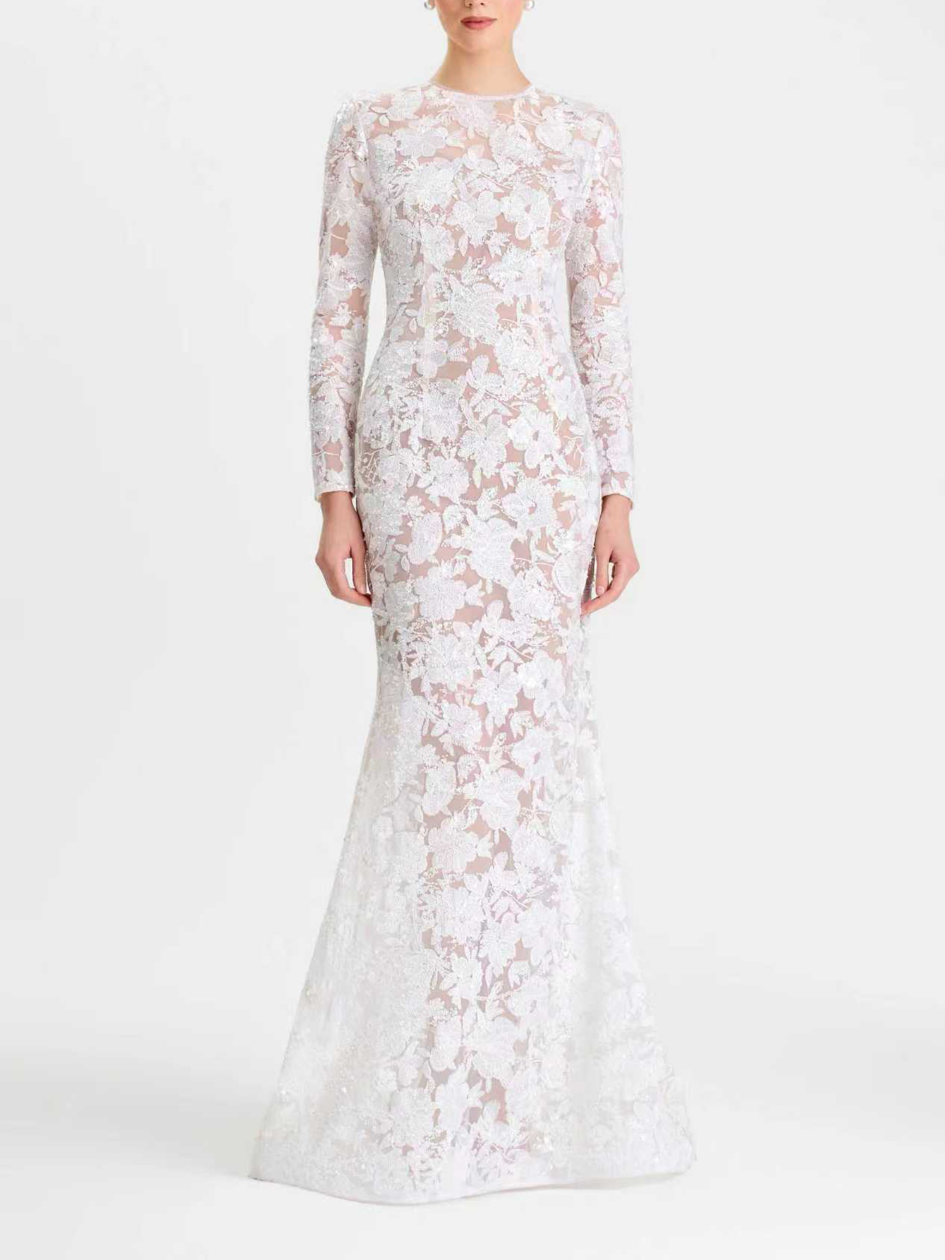 This elegant maxi dress is crafted from exclusive sheer mesh with full mesh lining, featuring delicate white embroidered floral detailing for elegant coverage. Cut to a bodycon silhouette with a flared hemline and train detailing, it has a classic crew neckline, long sleeves with subtle shoulder padding for balanced sophistication, and a concealed back zip closure for a smooth fit. An optional nude slip offers versatile coverage, perfect for all your memorable milestone moments.
